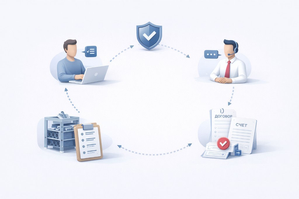 У каждого этапа есть понятные правила: кто ведёт диалог, как информация передаётся менеджеру, складу и документообороту. Это снимает хаос и помогает держать обещанные сроки.