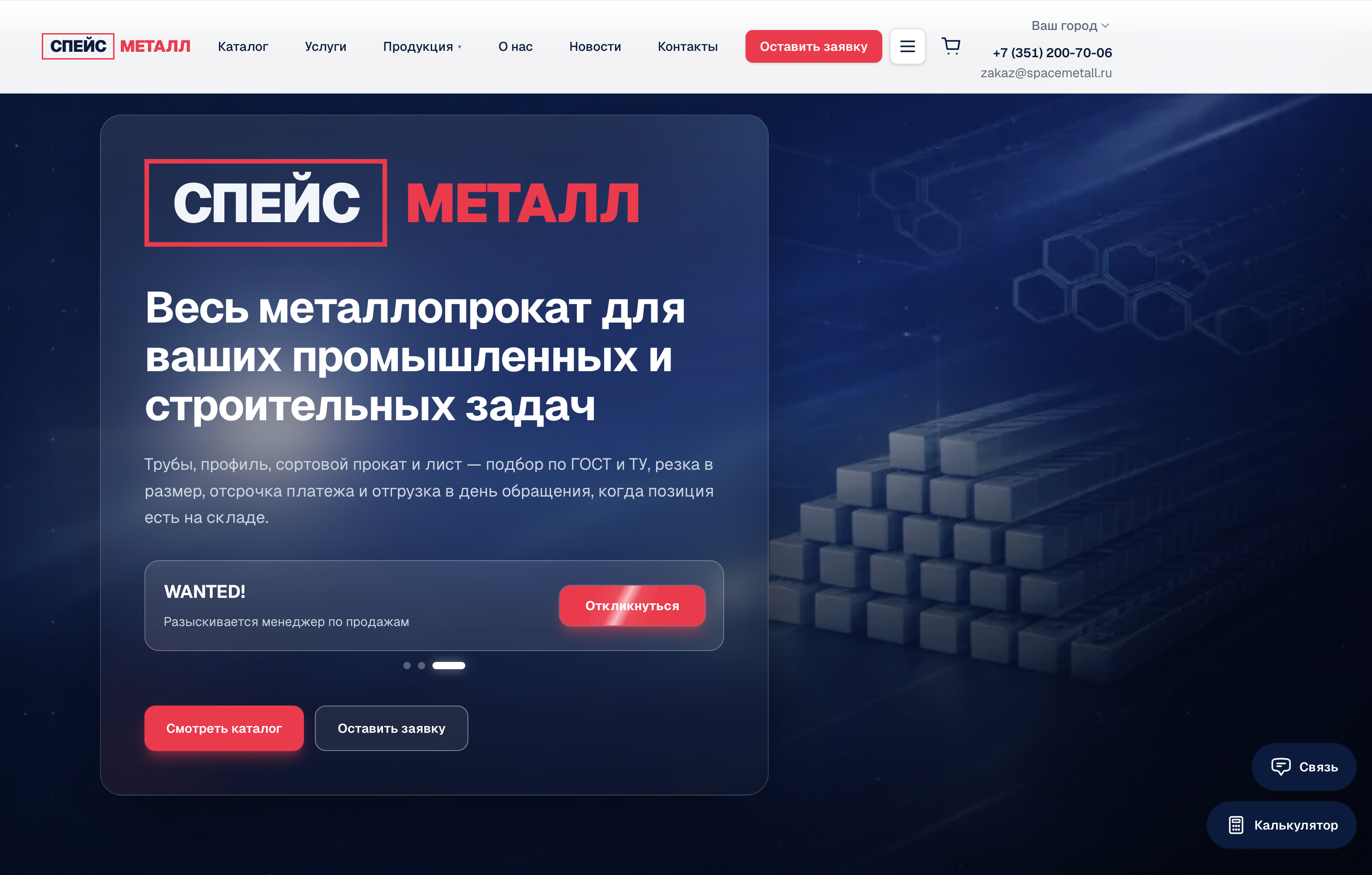 Мы обновили интерфейс сайта SpaceMETALL, чтобы сделать работу с ним максимально простой, понятной и быстрой для наших клиентов. Главная задача обновления — убрать лишние действия и сократить путь клиента от запроса до оформления заказа. Что изменилось: — Упростили структуру сайта — теперь всё интуитивно понятно с первых секунд — Переработали формы заявок — минимум полей, максимум скорости — Улучшили навигацию по ассортименту металлопроката — Добавили быстрые точки входа для связи с менеджером — Оптимизировали сайт под скорость работы и загрузки Теперь оформление заявки занимает минимальное время и не вызывает лишних сложностей — всё построено так, чтобы клиент мог быстро получить нужный результат. Особое внимание уделили интеграции с нашей CRM-системой: каждая заявка моментально попадает в работу, без потерь и задержек. Это обновление — ещё один шаг к тому, чтобы сделать взаимодействие с SpaceMETALL максимально удобным и эффективным для наших клиентов.